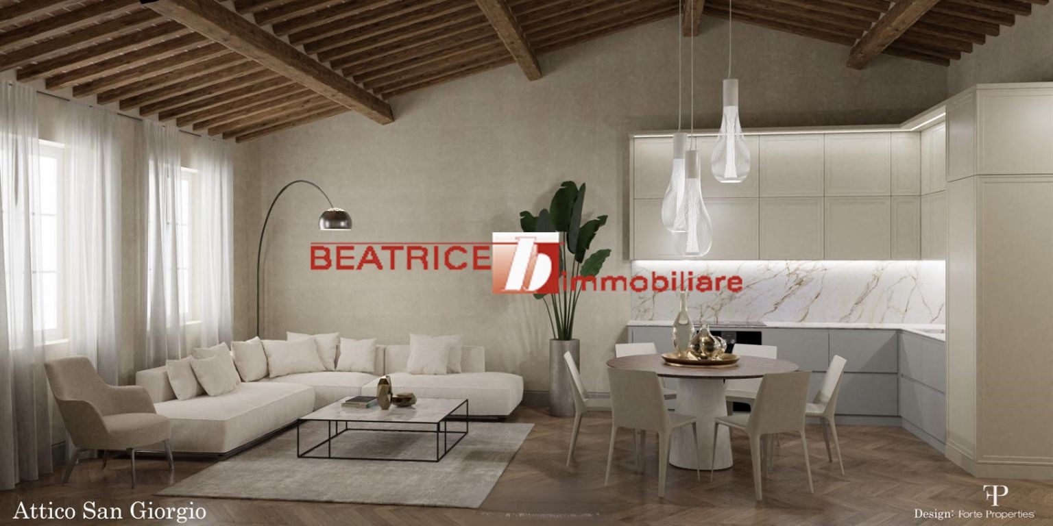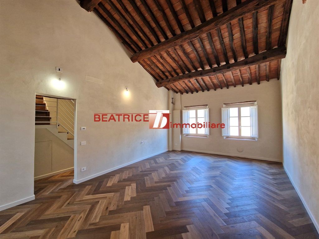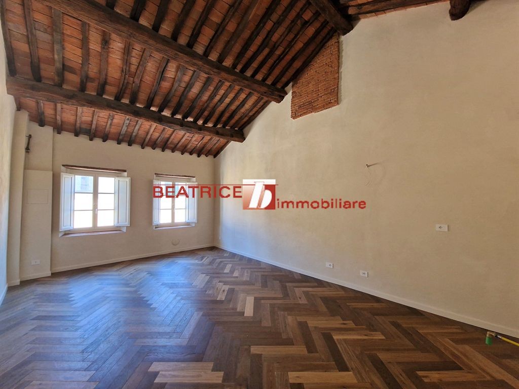CENTRO STORICO - Caratteristico attico ubicato al terzo ed ultimo piano di piccolo palazzo restaurato con tetto totalmente rifatto, la cui scala è agevole e la loggia ampia consente il parcheggio delle biciclette. L'appartamento è completamente ristrutturato con materiali e finiture di alta qualità e in modo da conservare anche il tipico stile rustico Lucchese, tra i comforts di cui è dotato sono compresi il riscaldamento a pavimento e la predisposizione di aria condizionata. E' composto da ingresso-disimpegno, ampio soggiorno con cucina a vista di mq. 40 netti, bagno finestrato, ripostiglio, piccolo disimpegno zona notte, due camere matrimoniali, altro bagno; mediante una scala in legno di design, si accede ad un'altana chiusa molto luminosa e con una bellissima vista sui monumenti e le colline della città, da poter utilizzare come secondo soggiorno o terza camera. Classe energetica D, Ep 80 kWh/mq. anno. Richiesta trattabile.