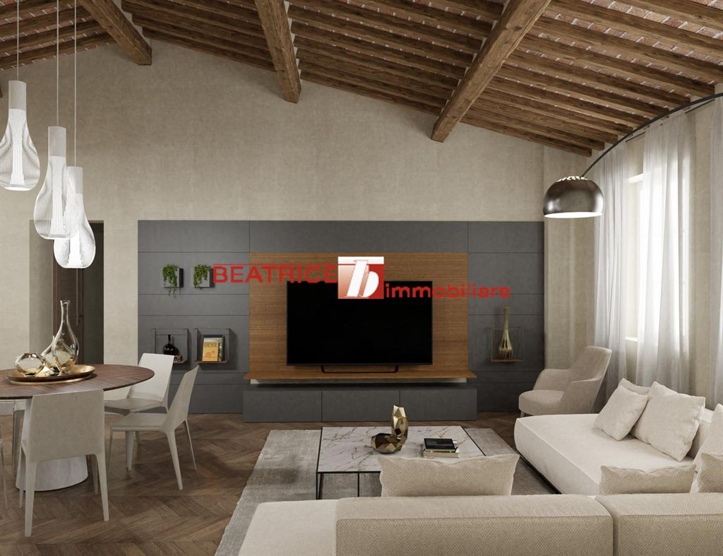 HISTORICAL CENTRE - Characteristic attic on the third and last floor of a small renovated building whose staircase is easy and the large loggia allows parking bicycles. The apartment is completely restored with high quality materials and finishes and also keeping attention to preserve the typical rustic style of Lucca, among its comforts it is equipped with floor heating and air conditioning predisposition. It consists of an entrance-hallway, a large living room with open plan kitchen of sqm. 40 net, two double bedrooms, two bathrooms, a storage area; through a wooden staircase, you access to a very light altana with a beautiful view on the monuments and hills of the town, to be used as a second living room or a third bedroom. Energy class D, Ep 80 kWh/mq. year. Asking price negotiable.